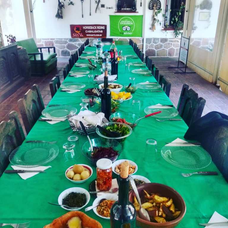 Almuerzo: Generalmente carnes asadas con verduras a la parrilla, ensaladas diferentes para vegetarianos, pan, vino local, etc. Aproximadamente a las 13:30hs.