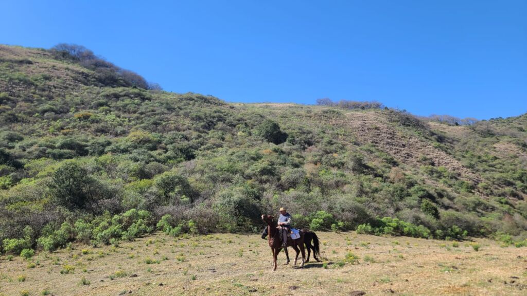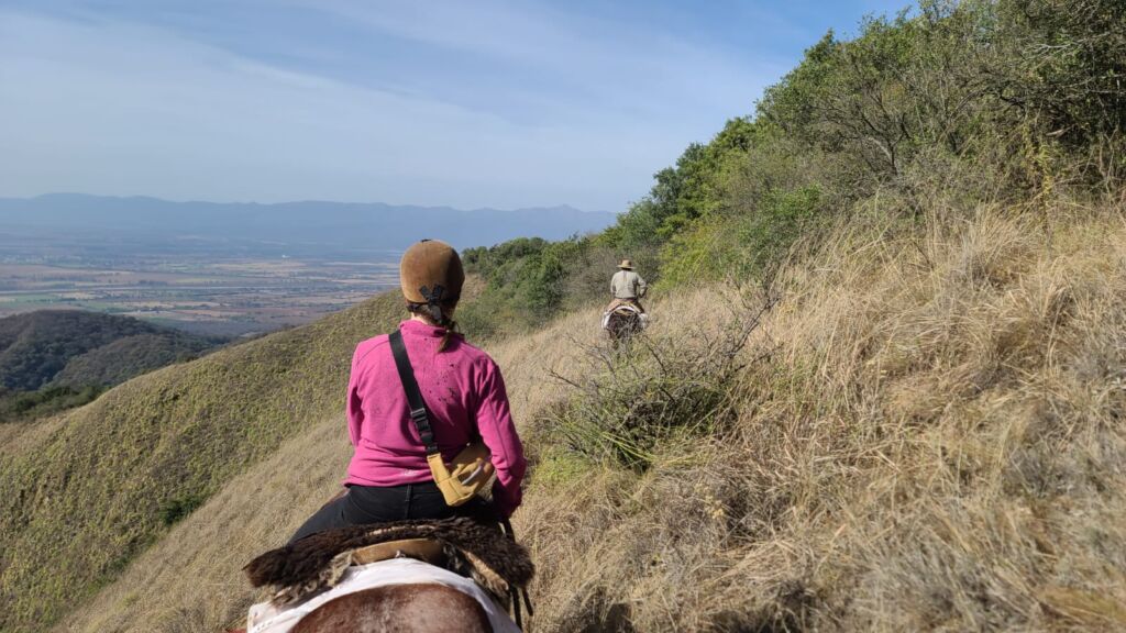 10.30hs – Se prepara para la cabalgata: polainas, casco y se inicia recorrido por sendas y caminos rurales hasta llegar a la base de la montaña, donde se inciará el ascenso al Alto chivilme.