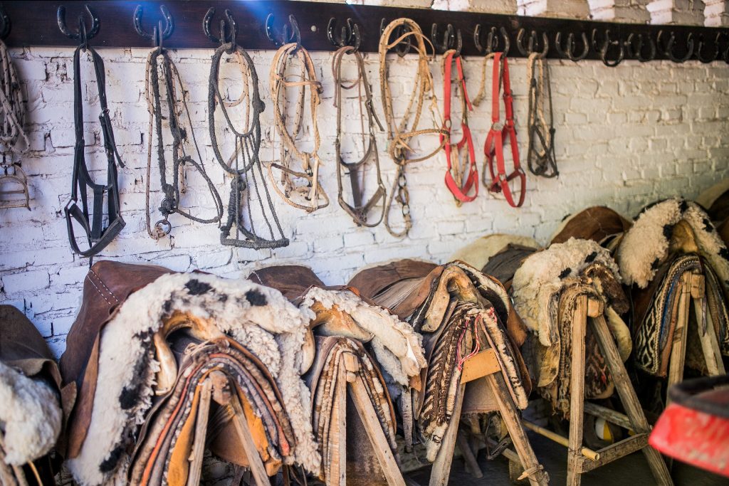 – Equipo completo para cabalgar (montura completa, alforja, polainas, casco, capa de lluvia)